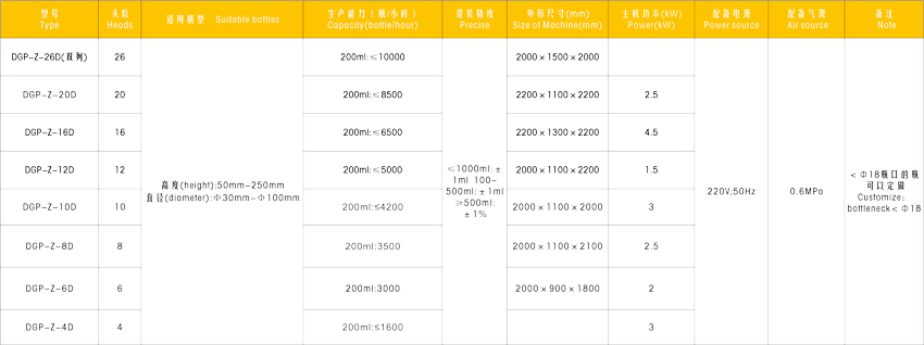| 生產(chǎn)能力(1L計) | 1800瓶/時(shí) | 2400瓶/時(shí) | 3000瓶/時(shí) | 3600瓶/時(shí) | 4800瓶/時(shí) | 6000瓶/時(shí) |
